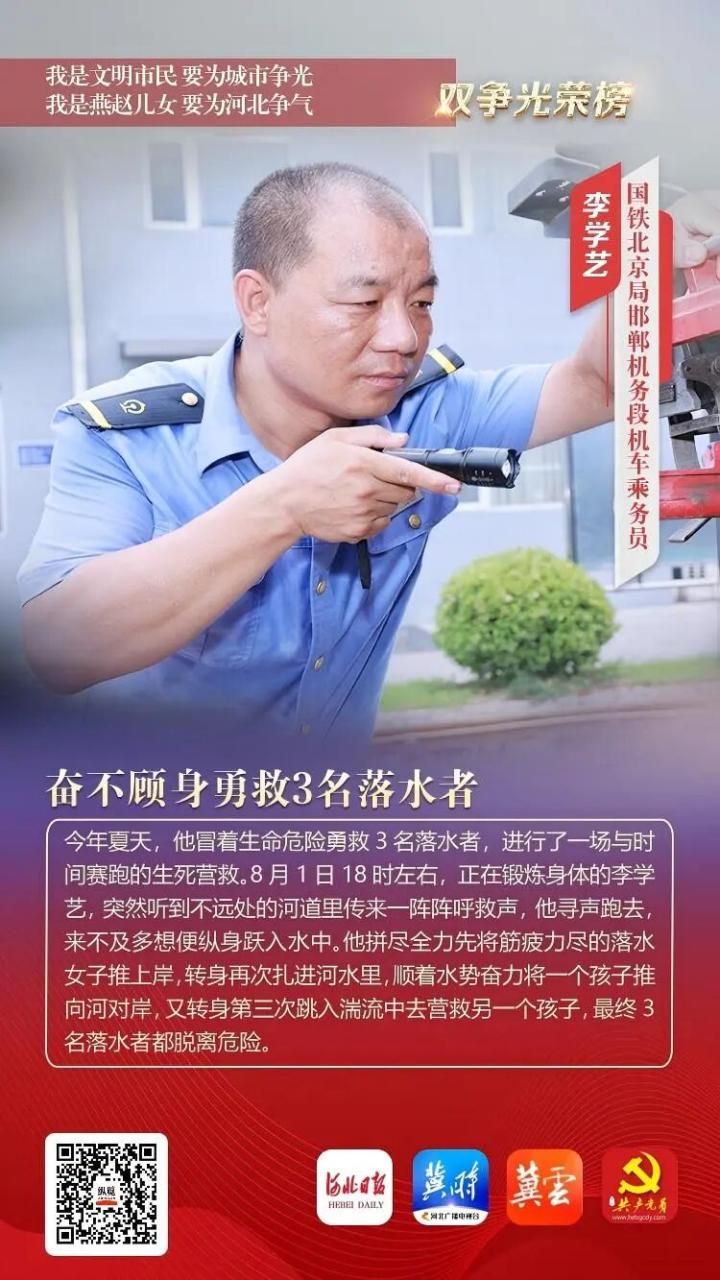 今年夏天,他冒着生命危险勇救3名落水者,进行了一场与时间赛跑的生死营救。8月1日18时左右,正在锻炼身体的李学艺,突然听到不远处的河道里传来一阵阵呼救声,他寻声跑去,来不及多想便纵身跃入水中。他拼尽全力先将筋疲力尽的落水女子推上岸,转身再次扎进河水里,顺着水势奋力将一个孩子推向河对岸,又转身第三次跳入湍流中去营救另一个孩子,最终3名落水者都脱离危险。