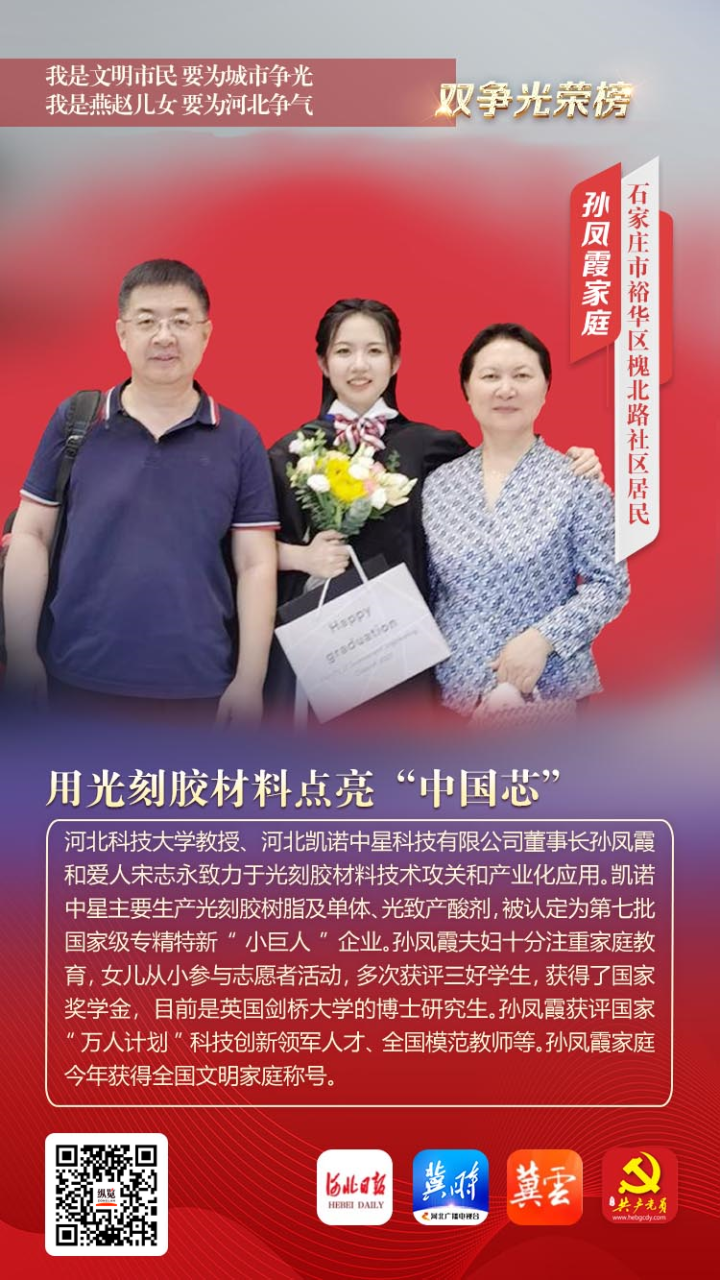 河北科技大学教授、河北凯诺中星科技有限公司董事长孙凤霞和爱人宋志永致力于光刻胶材料技术攻关和产业化应用。凯诺中星主要生产光刻胶树脂及单体、光致产酸剂,被认定为第七批国家级专精特新“小巨人”企业。孙凤霞夫妇十分注重家庭教育,女儿从小参与志愿者活动,多次获评三好学生,获得了国家奖学金,目前是英国剑桥大学的博士研究生。孙凤霞获评国家“万人计划”科技创新领军人才、全国模范教师等。孙凤霞家庭今年获得全国文明家庭称号。