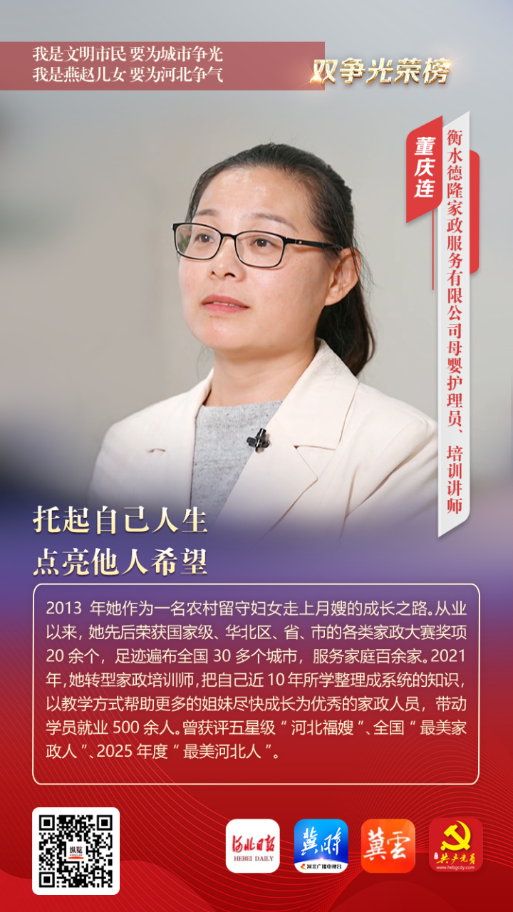 2013年她作为一名农村留守妇女走上月嫂的成长之路。从业以来,她先后荣获国家级、华北区、省、市的各类家政大赛奖项20余个,足迹遍布全国30多个城市,服务家庭百余家。2021年,她转型家政培训师,把自己近10年所学整理成系统的知识,以教学方式帮助更多的姐妹尽快成长为优秀的家政人员,带动学员就业500余人。曾获评五星级“河北福嫂”、全国“最美家政人”、2025年度“最美河北人”。