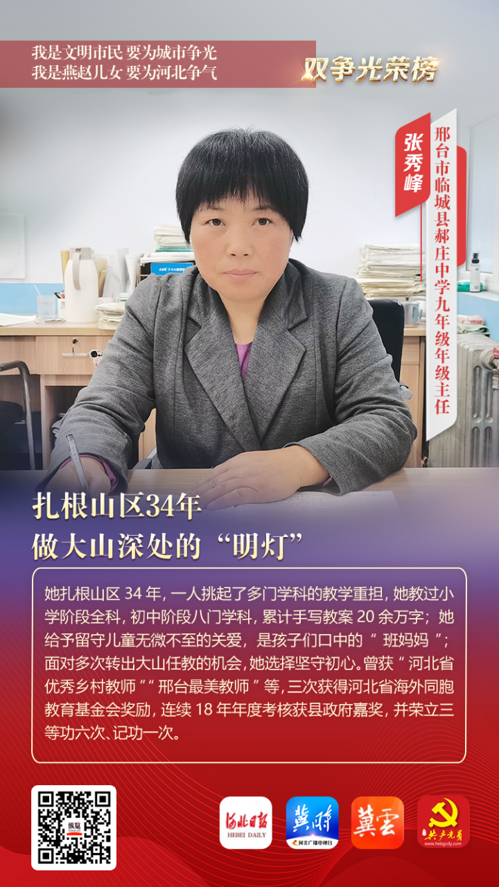 她扎根山区34年,一人挑起了多门学科的教学重担,她教过小学阶段全科,初中阶段八门学科,累计手写教案20余万字;她给予留守儿童无微不至的关爱,是孩子们口中的“班妈妈”;面对多次转出大山任教的机会,她选择坚守初心。曾获“河北省优秀乡村教师”“邢台最美教师”等,三次获得河北省海外同胞教育基金会奖励,连续18年年度考核获县政府嘉奖,并荣立三等功六次、记功一次。