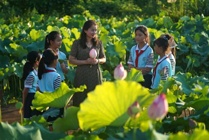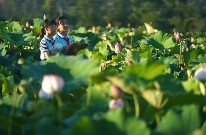 孩子们在荷塘采风。图片来源:新华社