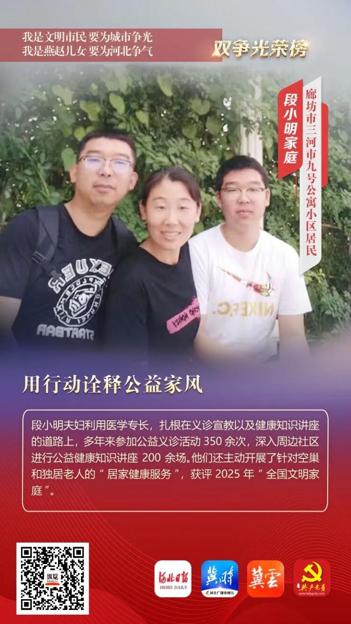 段小明夫妇利用医学专长,扎根在义诊宣教以及健康知识讲座的道路上,多年来参加公益义诊活动350余次,深入周边社区进行公益健康知识讲座200余场。他们还主动开展了针对空巢和独居老人的“居家健康服务”,获评2025年“全国文明家庭”。
