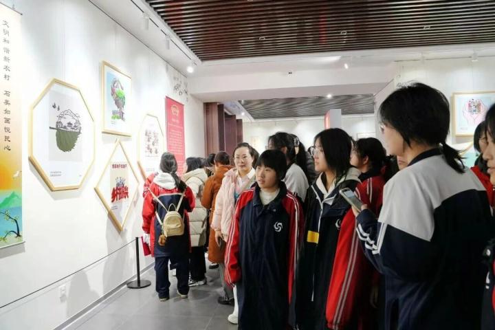 让文明新风从“笔尖”流淌到“心间”。展览现场吸引了不少学生、志愿者和周围群众前来参观。“作品创作的过程,既是自我学习的过程,也是倡导文明新风的一次实践。”无极野风美术职业中学高三学生何金松有四幅作品入选此次展览,他介绍道。