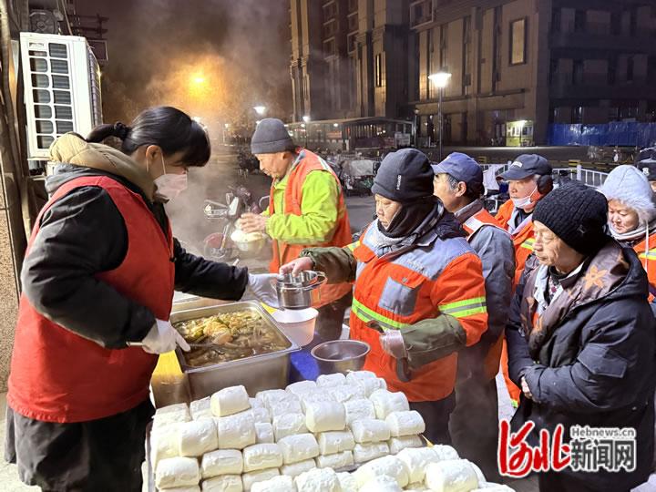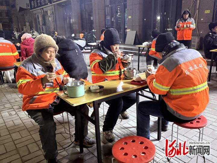 2025年12月24日,长安区众爱餐厅,环卫工人正在吃爱心早餐。河北日报客户端见习记者侯淼摄