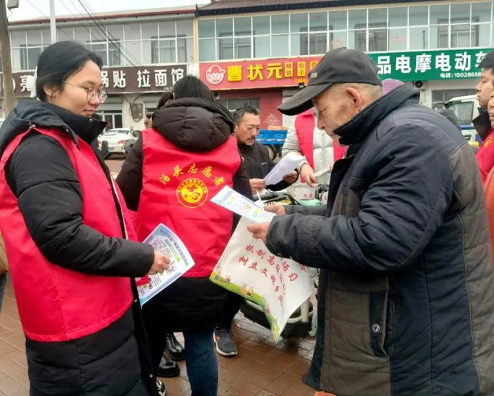 泊头市寺门村镇工作人员向群众发放文明宣传材料 摄影 毛如月