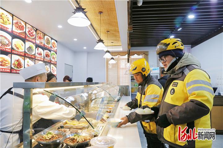 1月9日,在唐山玉田县无终街道昌盛社区居民服务中心的暖新食堂,外卖小哥们正在点餐。河北日报记者 师 源摄