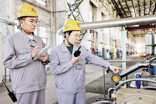 2025年9月9日,邓晶(右)在开滦集团中润公司甲醇分厂讲解合成设备知识。 开滦集团唐山中润煤化工有限公司供图