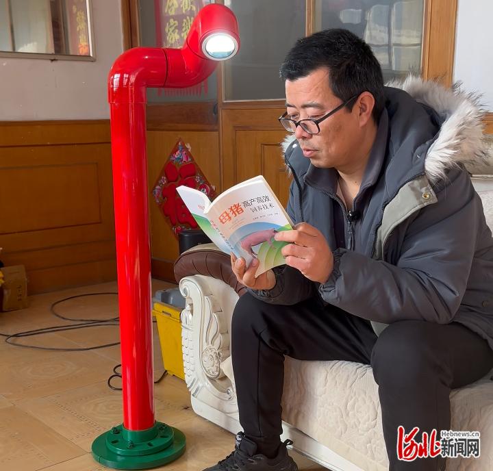 张学成和他用旧管子改造的语音照明灯。王镇供图