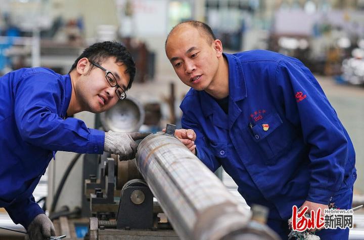 2月7日,祁峰(右)在查看焊接情况。 河北日报记者 耿辉摄