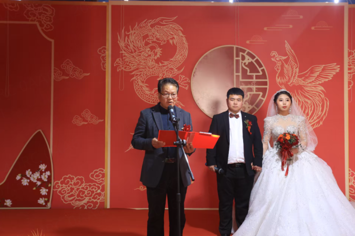 2024年5月20日,在河间市兴村镇大庄村举办的一场集体婚礼上,石炳启代表(左一)为新人证婚。石炳启供图(资料片)