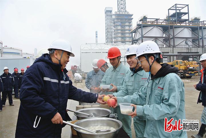 喊话的是河北凯意新材料科技有限公司董事长刘全利。他特意准备了两大桶热气腾腾的元宵,还搬来几箱苹果。