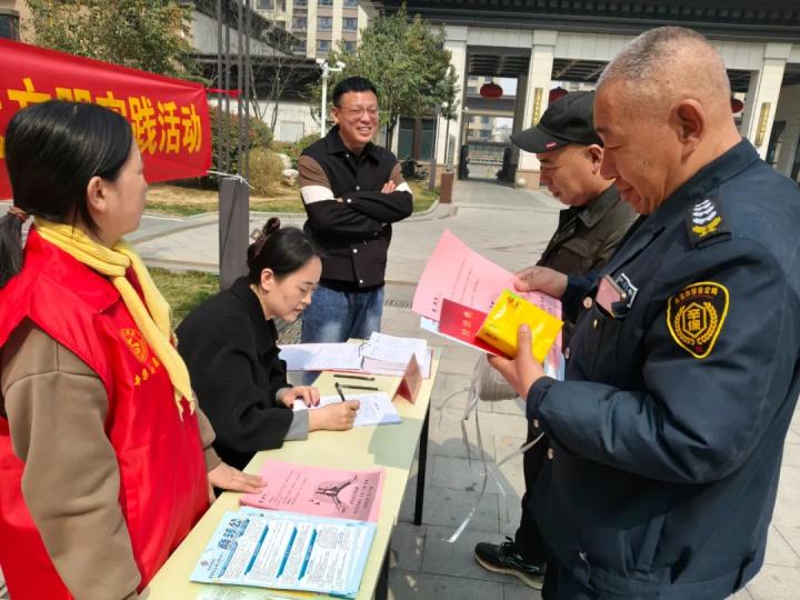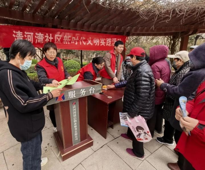 清河湾社区组织开展新时代文明实践志愿服务活动,工作人员向居民发放公益红娘宣传页、新时代文明实践成果展示资料,围绕医保养老、法治反诈等内容为居民提供精准政策解读服务。