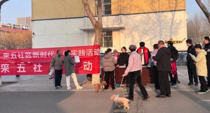 采五社区联合市人社局开展新时代文明实践志愿服务活动,设置公益红娘、新时代文明实践解读、社保政策咨询、法治宣传、法律援助等多项便民服务,收获了居民广泛认可。