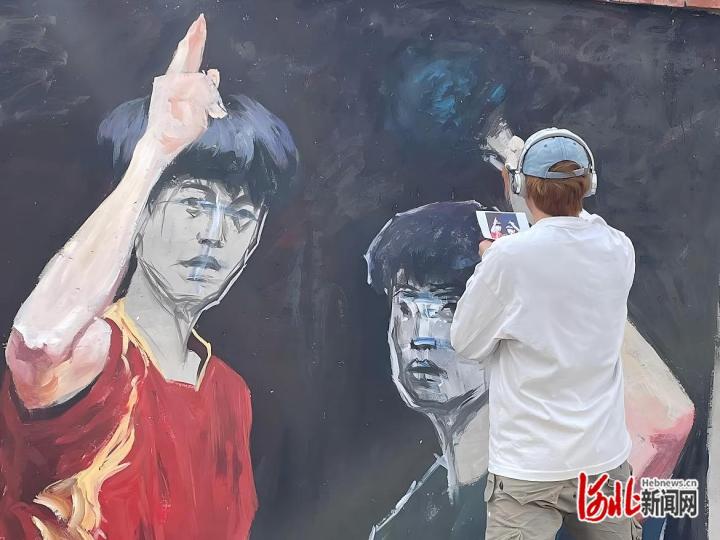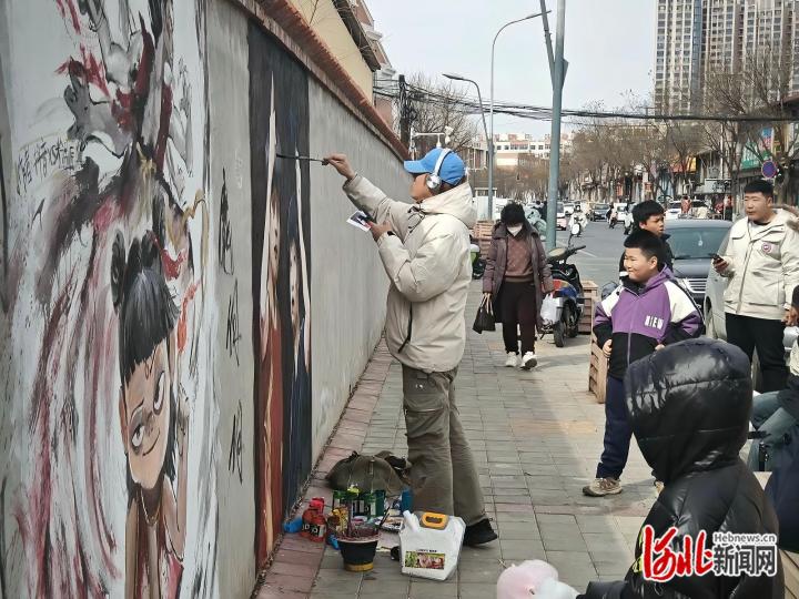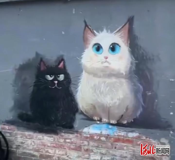 2025年1月,王晓刚回到承德丰宁老家,原本想在家中作画,家人担心弄脏家居环境劝阻了他。无法在家创作的他,索性将画板搬到了街头,完成了一幅以两只小猫为主题创作的街头墙绘。想不到,随手拍下的视频意外走红,也让他萌生了用墙绘宣传家乡的想法。“这是一种双向成就,我既能发挥专业所长,又能为家乡文旅宣传出一份力。”王晓刚说,也正是这幅作品,让他正式开启了以墙绘赋能家乡、点亮小城的征程。