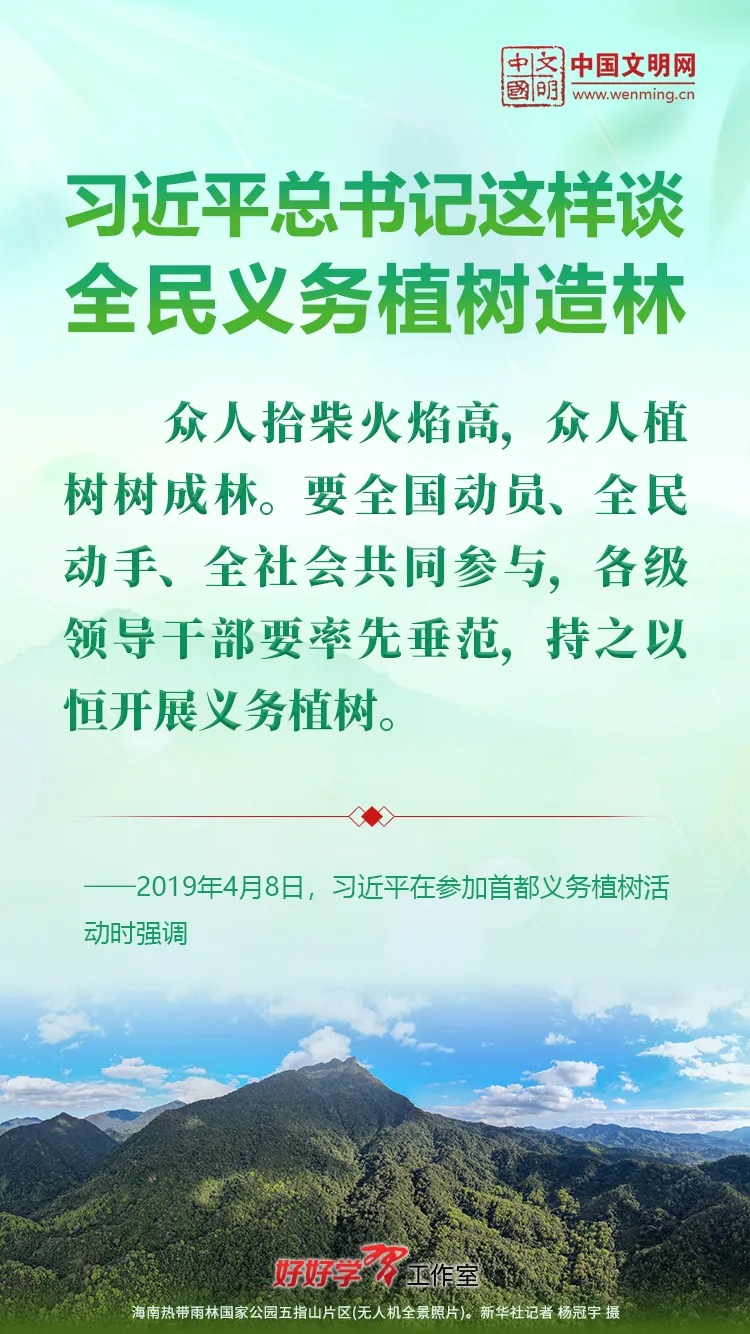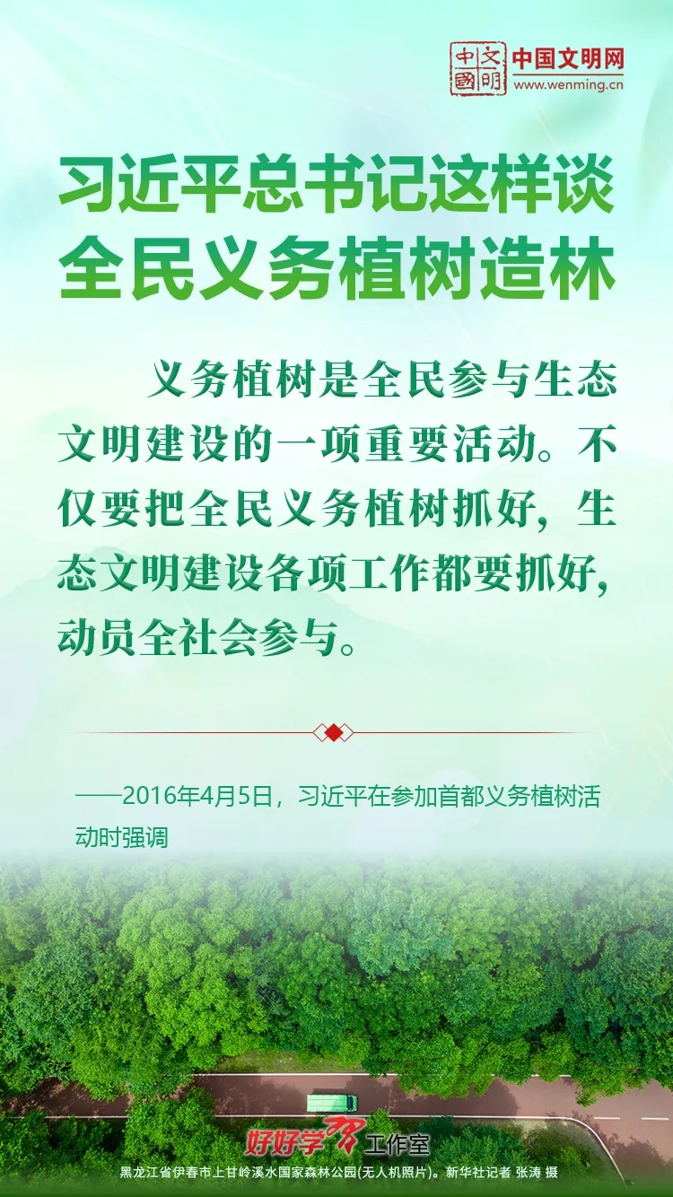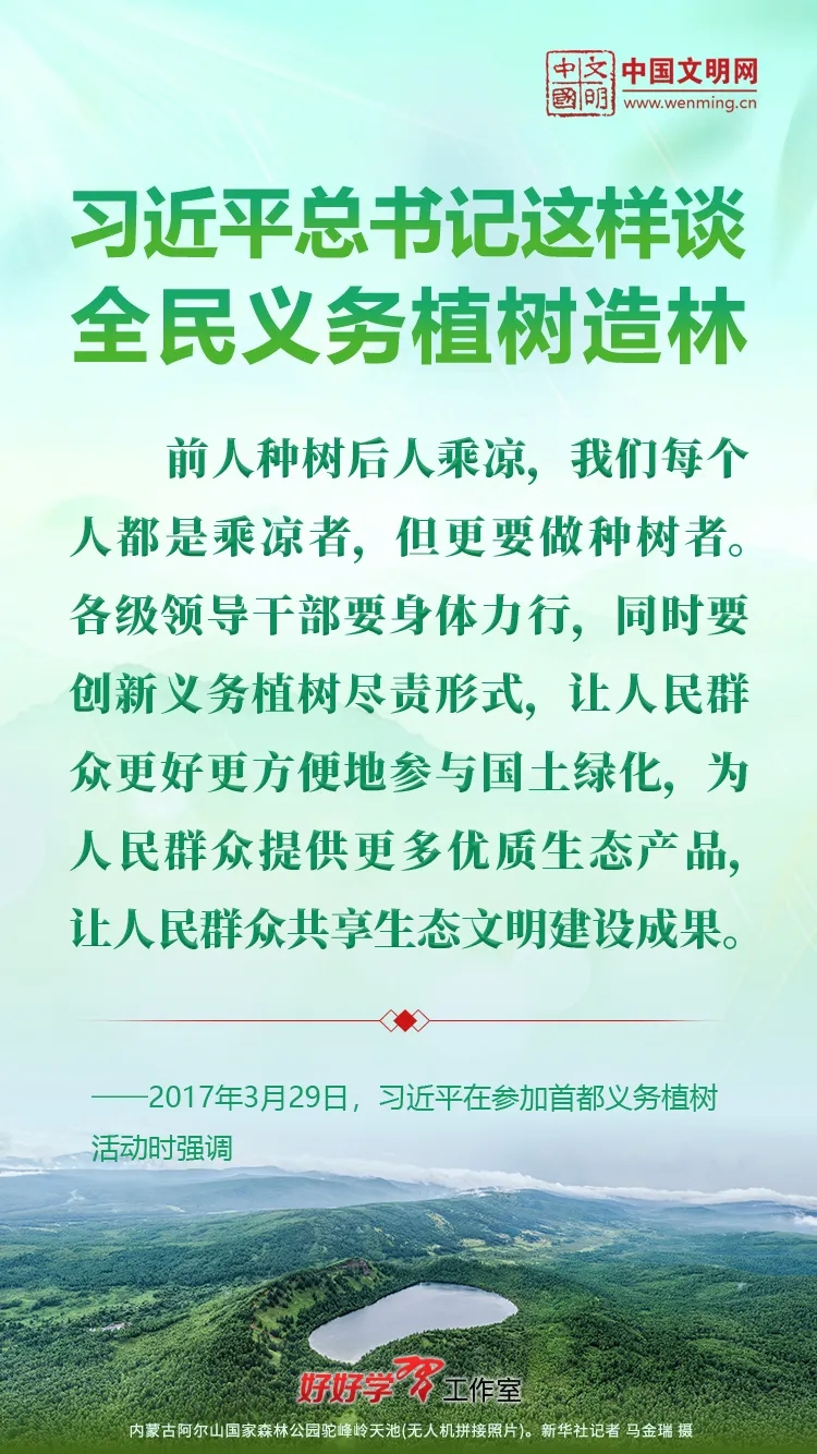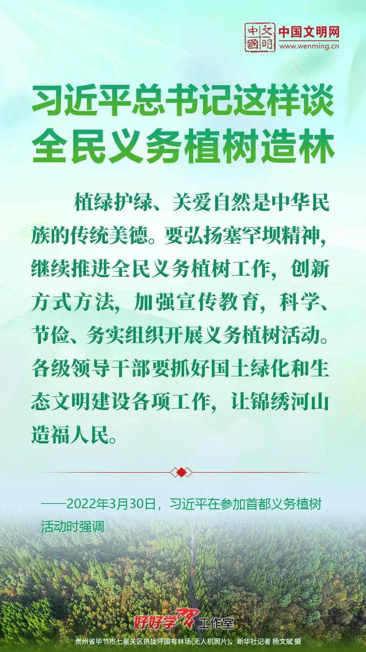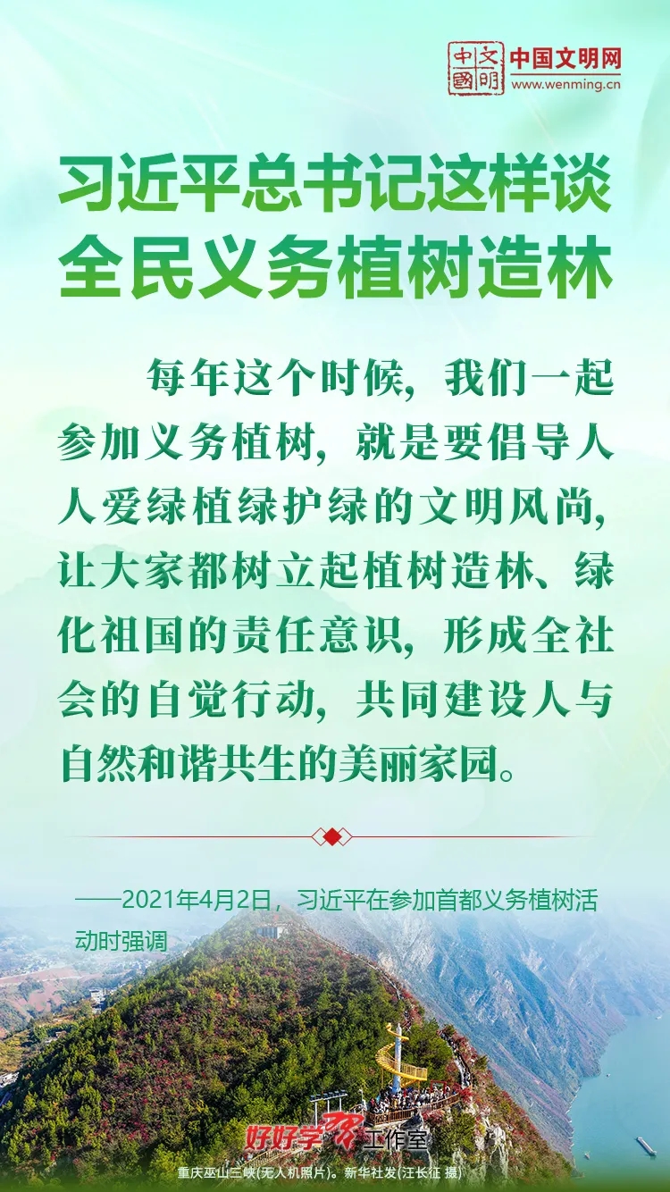习近平总书记始终关心国土绿化事业。党的十八大以来,习近平总书记每年都参加首都义务植树活动,并发表重要讲话。让我们一起重温习近平总书记关于植树造林的重要讲话精神,积极行动起来,从义务植树做起,植出绿水青山和金山银山,让祖国大地更加绿意盎然、生机勃发。