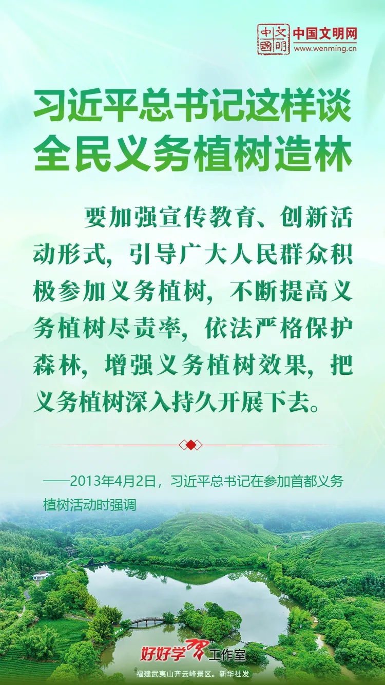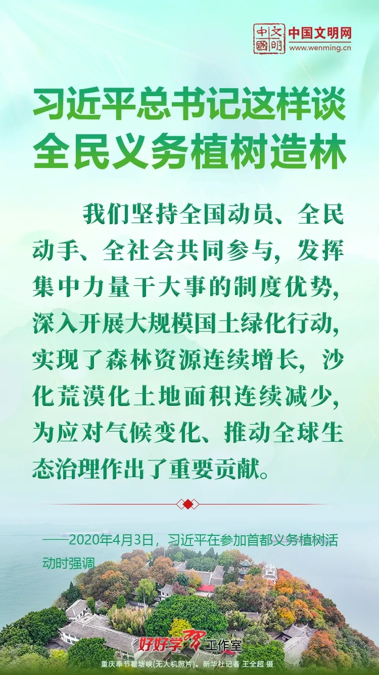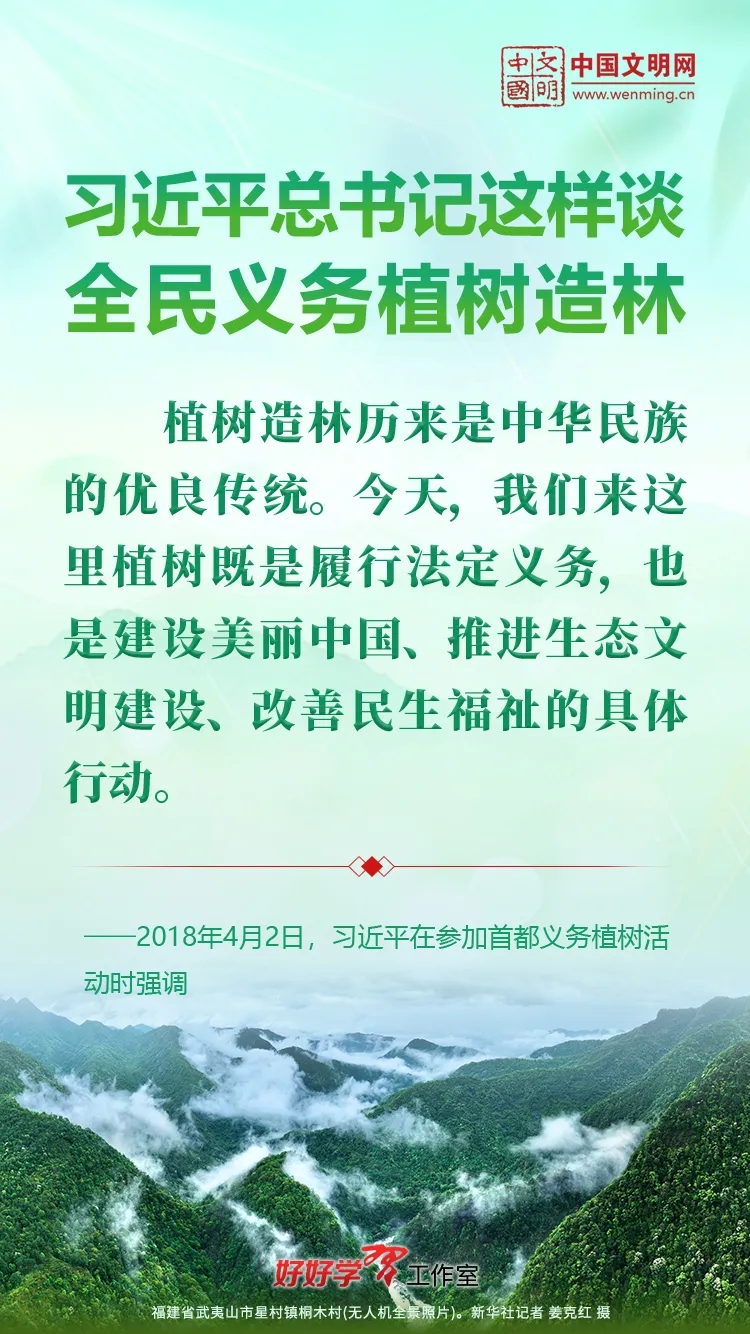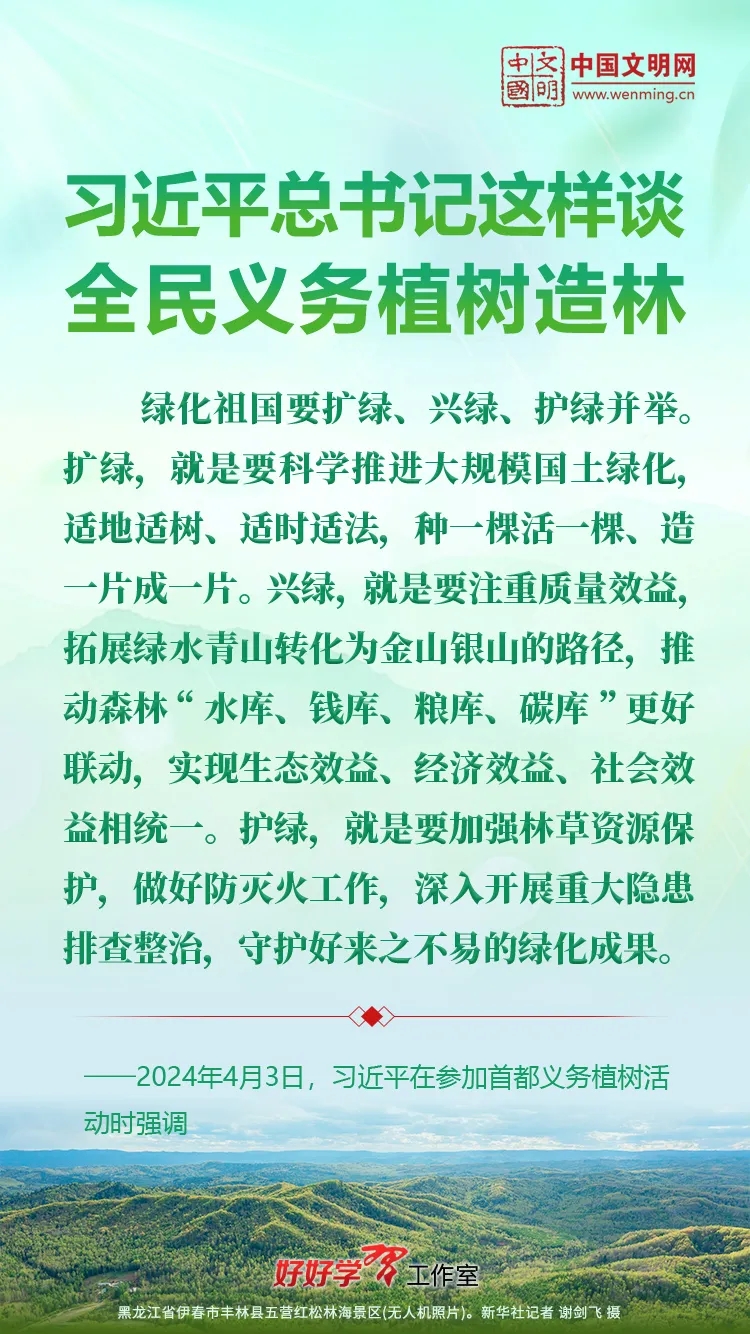 习近平总书记始终关心国土绿化事业。党的十八大以来,习近平总书记每年都参加首都义务植树活动,并发表重要讲话。让我们一起重温习近平总书记关于植树造林的重要讲话精神,积极行动起来,从义务植树做起,植出绿水青山和金山银山,让祖国大地更加绿意盎然、生机勃发。