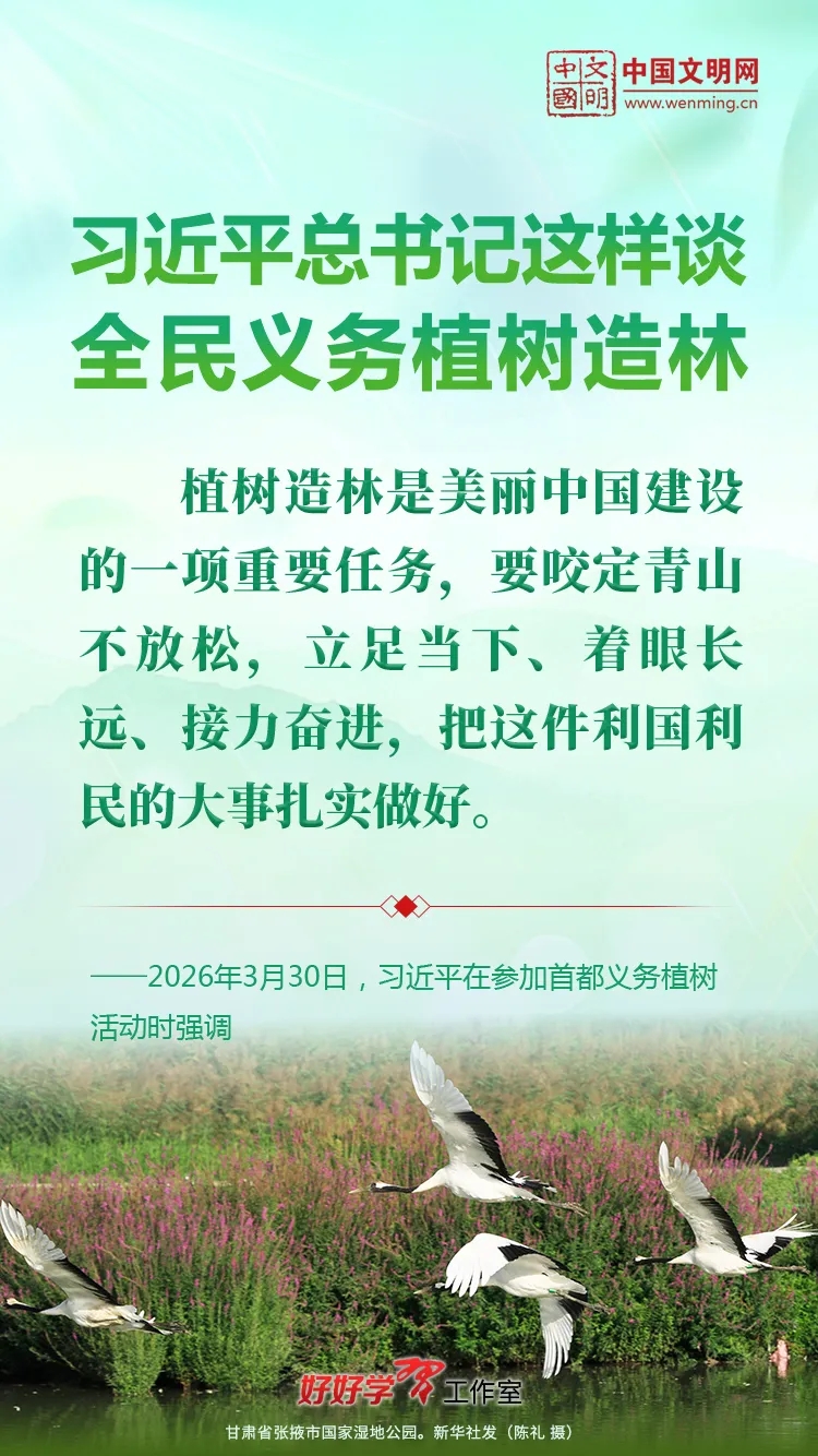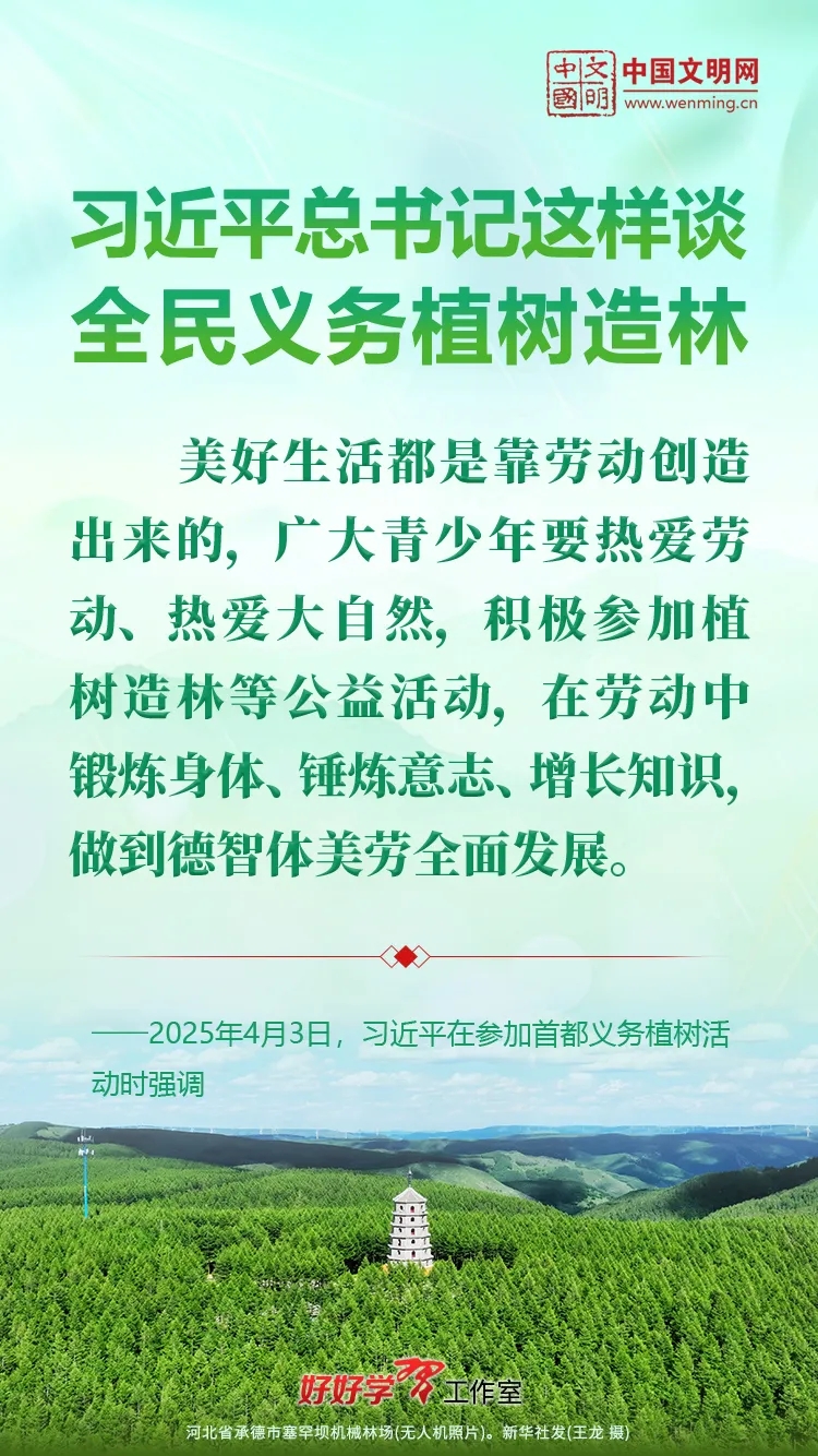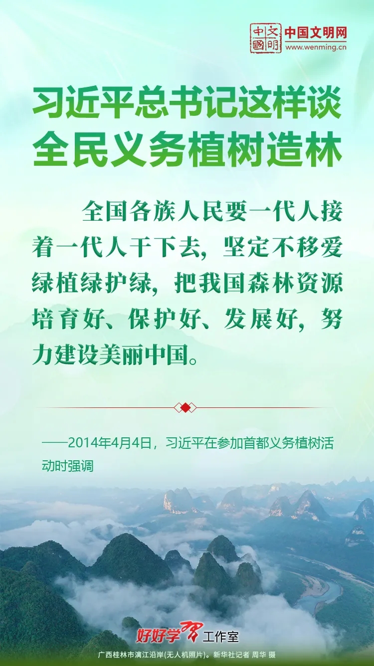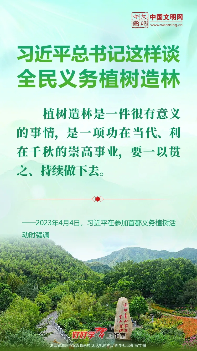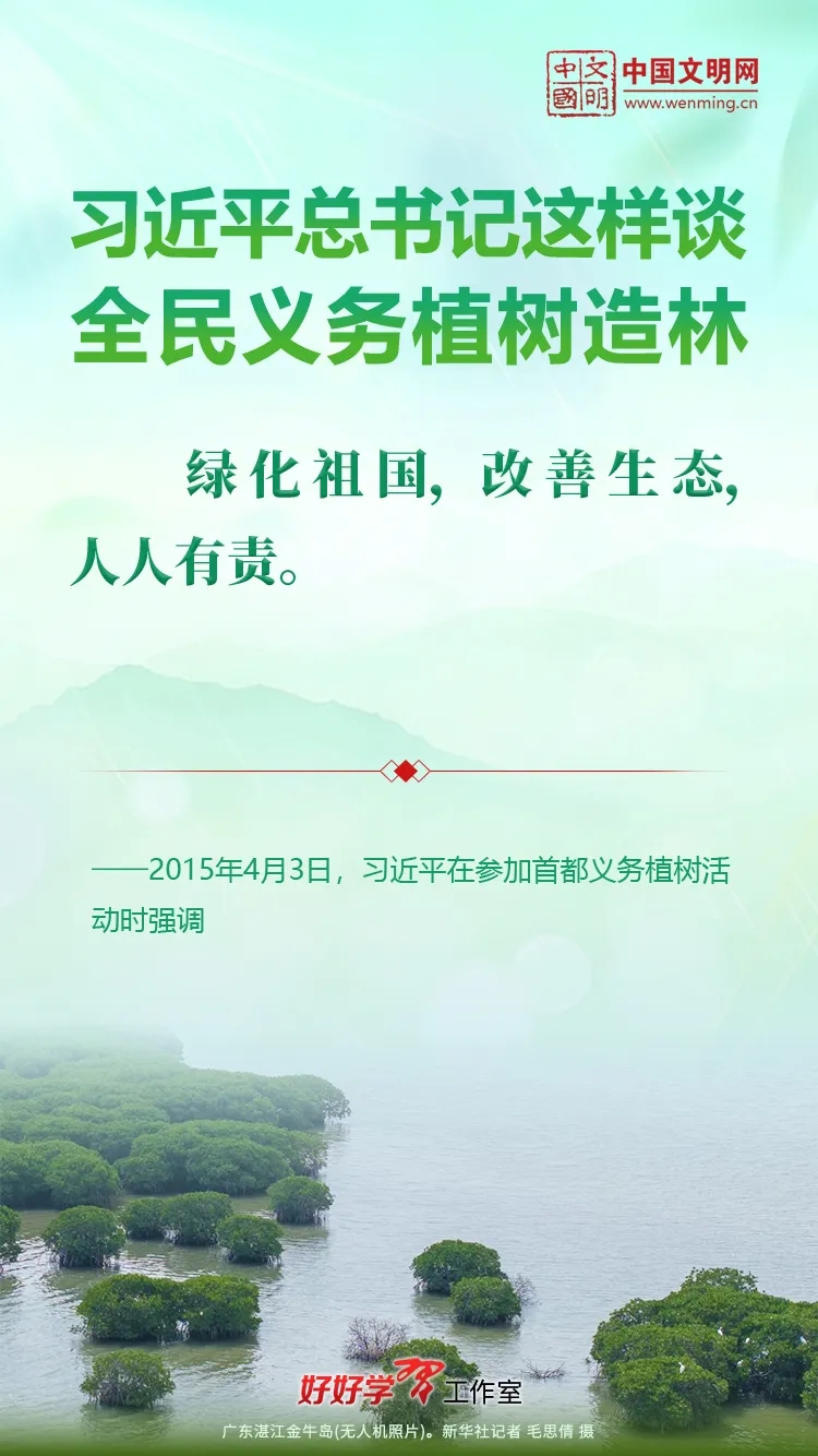 习近平总书记始终关心国土绿化事业。党的十八大以来,习近平总书记每年都参加首都义务植树活动,并发表重要讲话。让我们一起重温习近平总书记关于植树造林的重要讲话精神,积极行动起来,从义务植树做起,植出绿水青山和金山银山,让祖国大地更加绿意盎然、生机勃发。