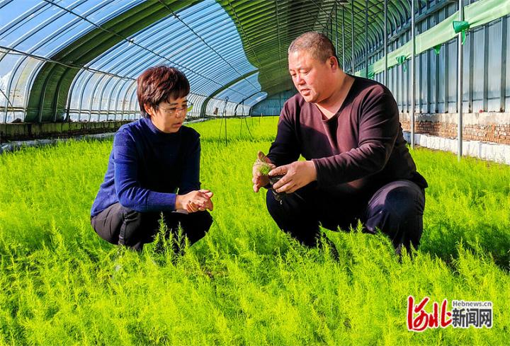 3月26日,孙喜玲(左)在查看大棚蔬菜的长势。河北日报记者 耿 辉摄